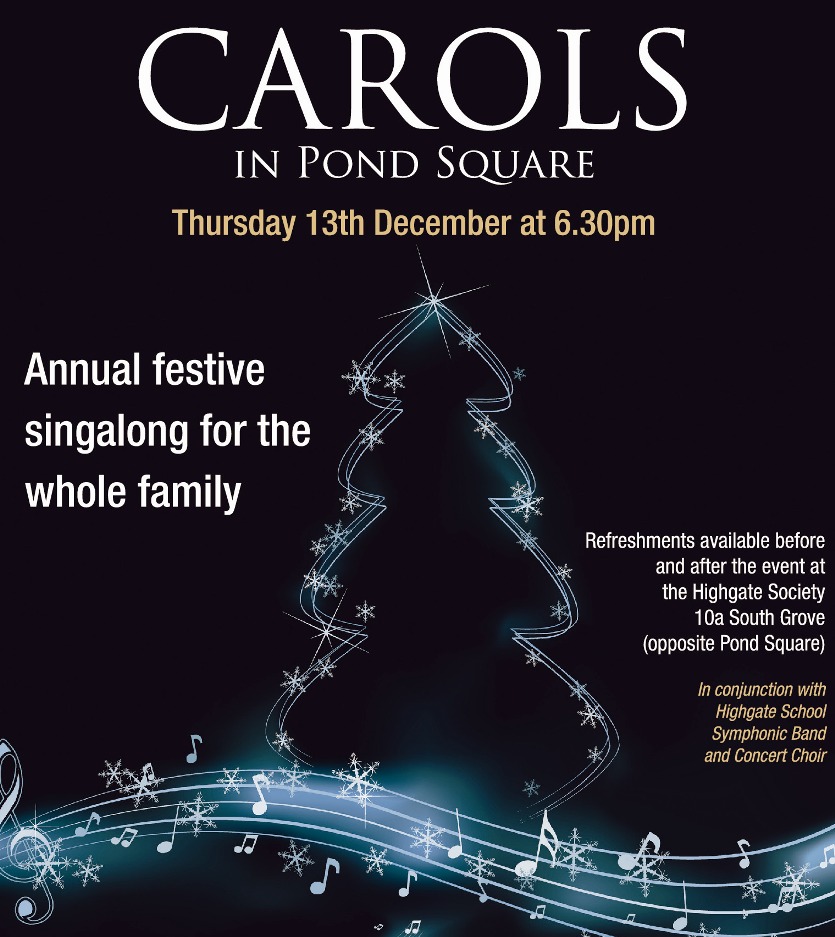 This festive occasion takes place on the13th December and starts at 6.30. Refreshments will be available before and after the event at the Highgate Society at 10a South Grove (opposite Pond Square). Highgate School's Symphonic Band and Concert Choir will provide the music and there will be a collection in aid of the Harrington Scheme.