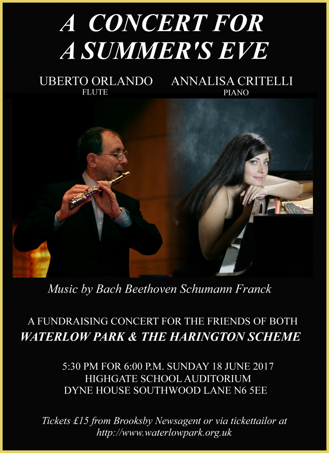 Here is a lovely way to spend a Sunday evening in June and support the Friends of Harington and Waterlow Park at the same time. On 18 June at 6p.m. in Dyne House, Highgate you can hear flautist Umberto Orlando and pianist Nataša Šarčević play pieces by Mouquet, Ravel, Poulenc, and Franck, with drinks on the terrace in the interval. Afterwards you’ll have time to eat out or just relax at home.